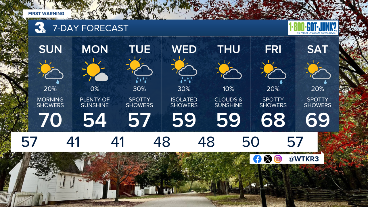 Much cooler temperatures arrive next week with highs in the mid to upper 50s. Spotty shower chances return after Tuesday.