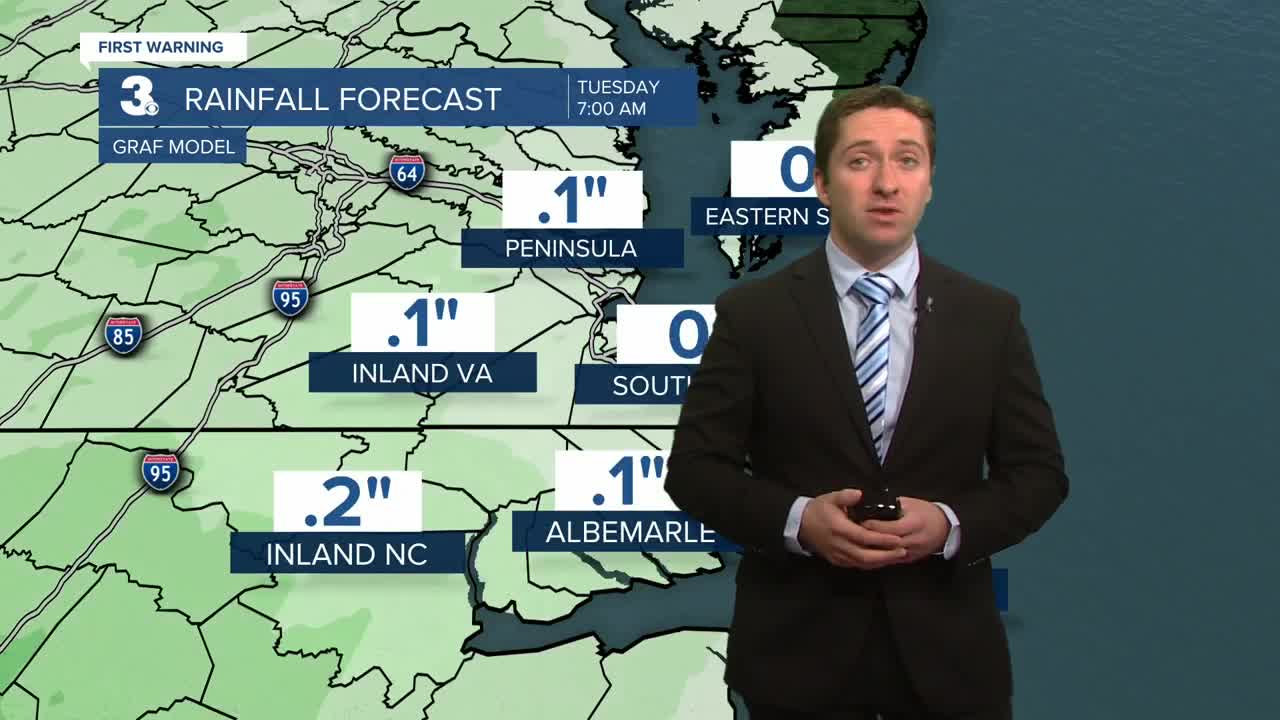 Don't forget that umbrella today! This morning rain will move in before sunrise, with light rain becoming steady to heavy rain at times between 8 am to 11 am. After lunchtime steady rain will turn to showers, with clearing expected to begin around sunset. High temperatures will reach the low to mid 50s, with winds out of the E at 5-10 mph, turning out of the NW at 10-15 mph. Temperatures will drop into the 40s quickly as winds turn from E to NW this afternoon. Rainfall will total between 1 to 1.5 inches, with locally heavier amounts possible on the Outer Banks. Overnight skies will clear with temperatures dropping into the 30s.