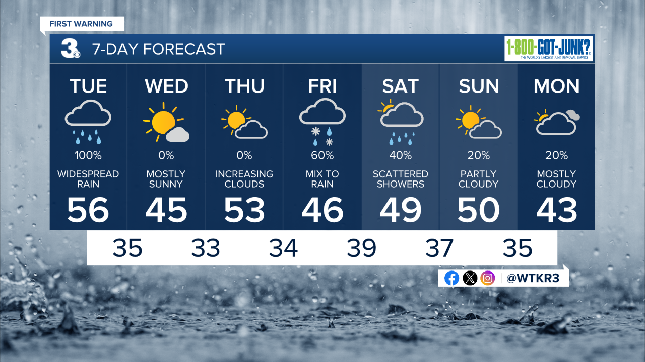 Our next system moves in on Friday as this active stretch of weather continues. Some wet snowflakes or rain/snow mix is possible Friday morning for inland areas, changing over to a cold rain during the afternoon. High temperatures will stay in the 40s with showers lingering into Saturday.