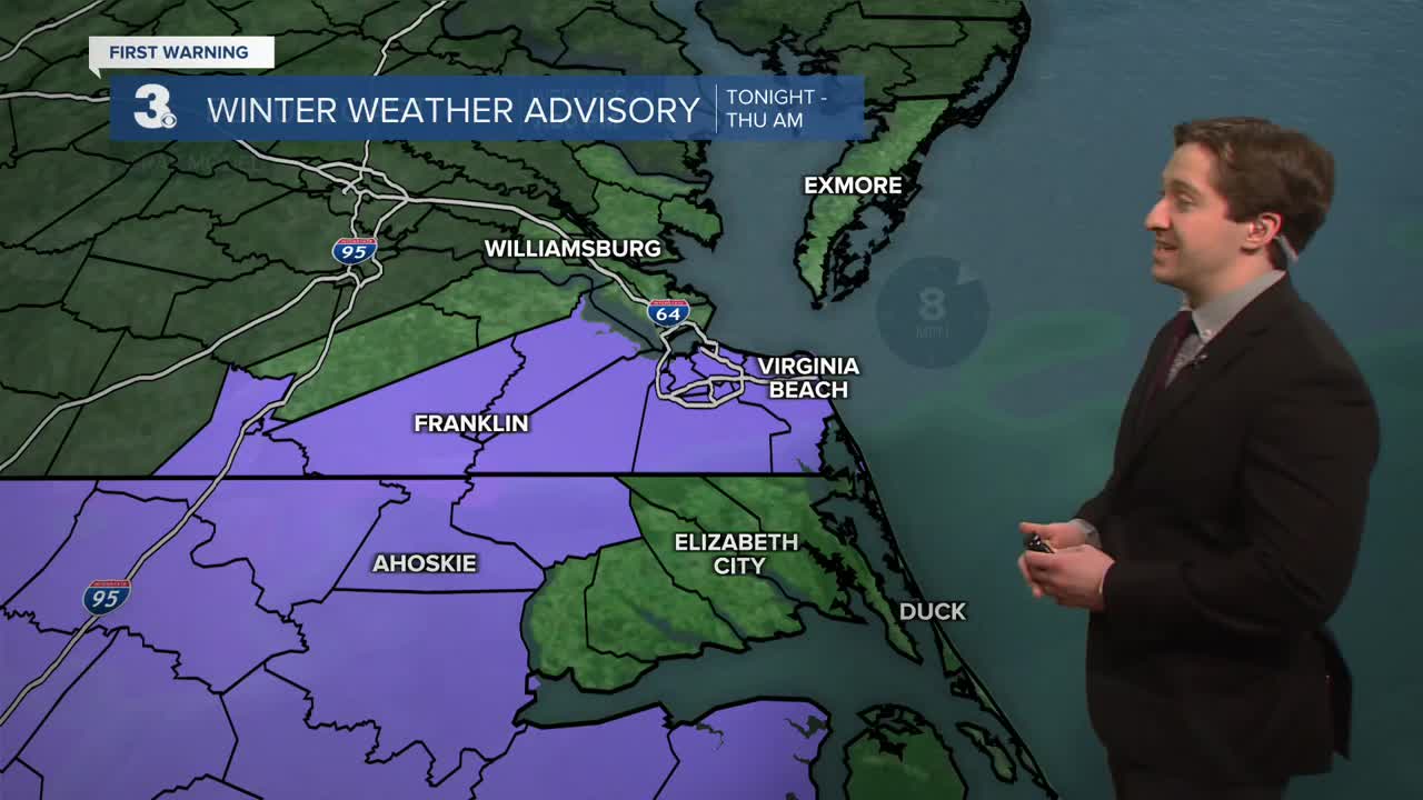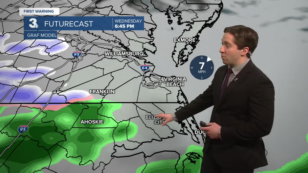 Friday will be mostly sunny to start with clouds building during the afternoon. Highs will be in the mid 30s to low 40s. We'll see a cold front move through during the afternoon, bringing some breezy conditions after lunchtime along with some flurries possible overnight. Saturday will start with temperatures in the upper 20s to mid 30s, with dropping temperatures during the afternoon as a second cold front moves across the region. Frigid wind chills are expected by Saturday afternoon, with feels like temperatures in the single digits. If you're planning on doing the Polar Plunge at the Oceanfront on Saturday at 1 PM, be prepared for some frigid conditions!
