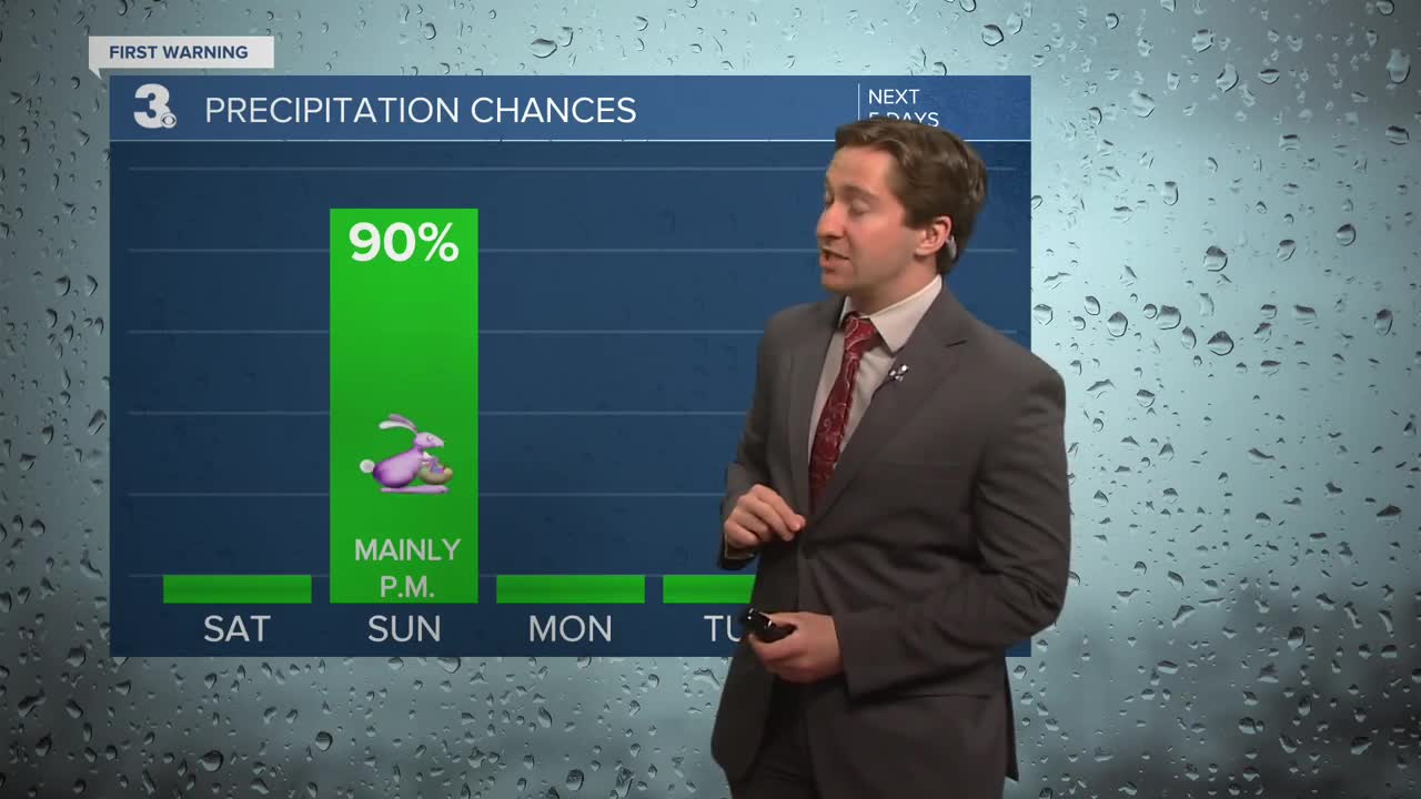 Easter Sunday (tomorrow!) will be warm and windy to start the day, with dry conditions expected during the morning. High temperatures will reach the mid 70s to low 80s, with w a cold front moving through during the afternoon. Along the cold front, a line of thunderstorms will develop and push through, with thunderstorms expected to develop after 12 pm and move through from west to east through 10 pm. Isolated storms could produce damaging wind gusts, keep an eye on the radar if you plan on traveling or have any outdoor activities tomorrow afternoon! It will be windy, with winds out of the SW at 10-20 mph gusting up to 30 mph.