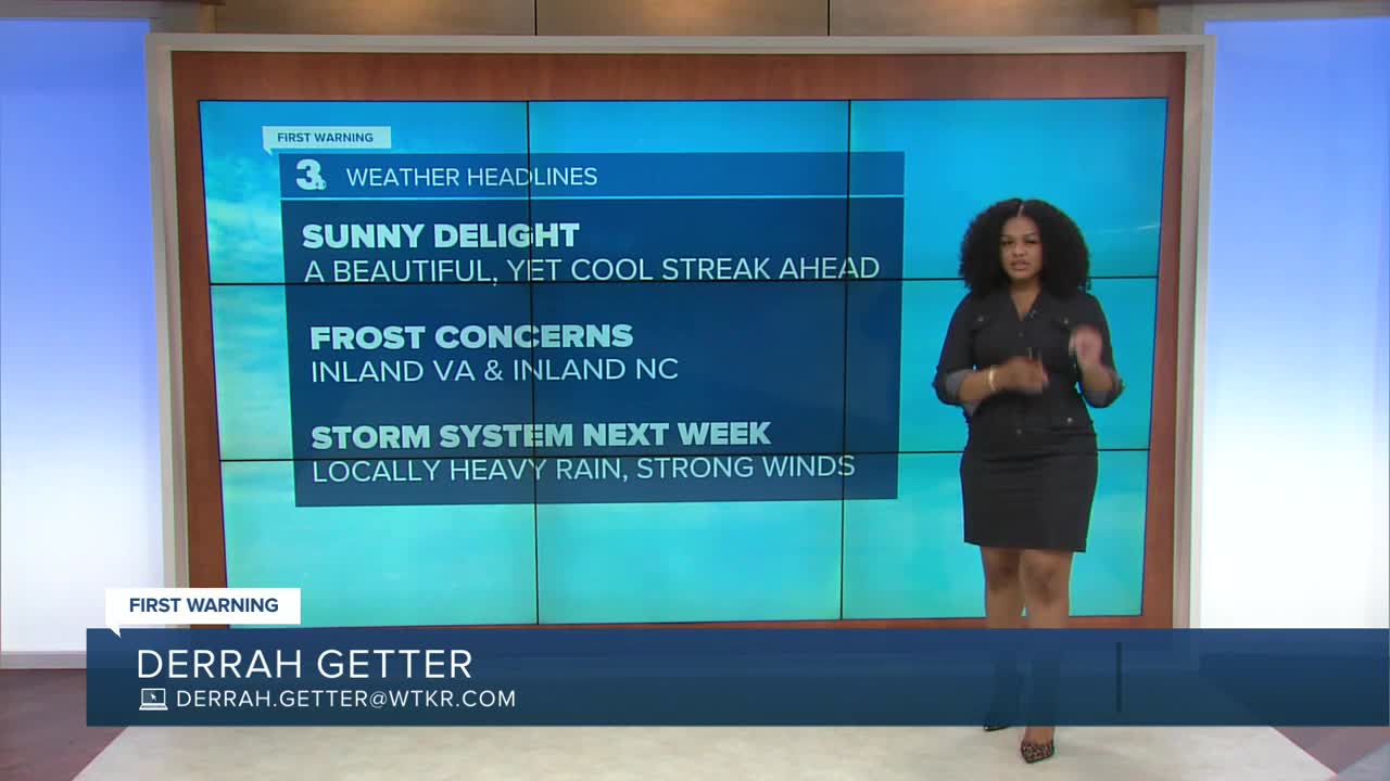 Highs this afternoon will reach the upper 60s. The clear skies will last tonight, giving us good conditions for a much cooler set up. Lows will be in the 30s and 40s. There is a frost advisory in effect for Sussex, Southampton, North Hampton and Hertford counties.