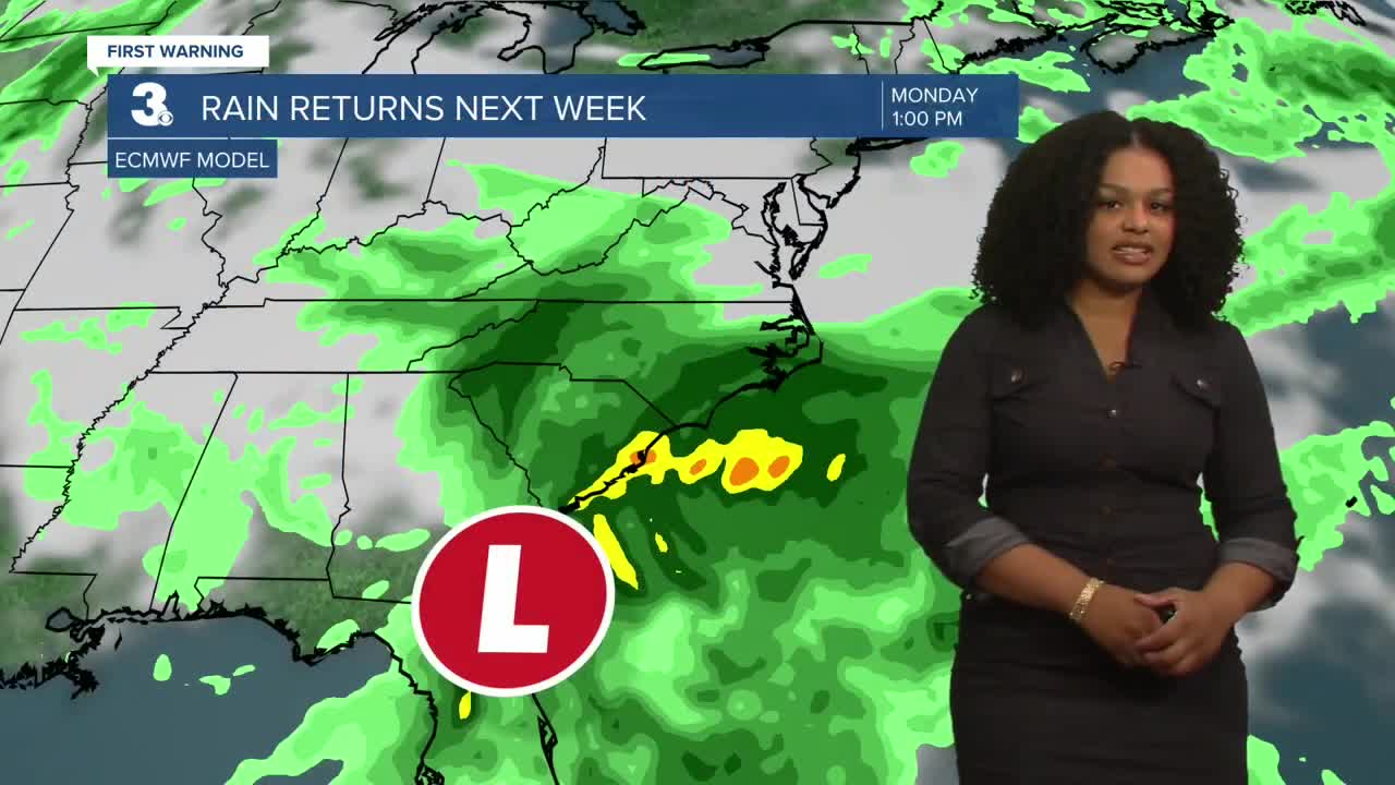 Rain chances return as a potential coastal low develops. Scattered showers will be possible from the beginning through the middle of next week.