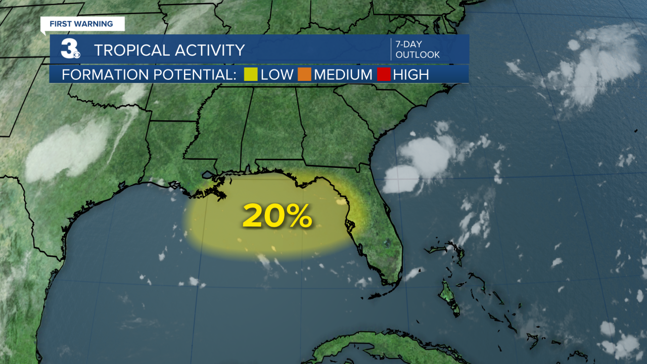 A trough of low pressure is forecast to form in the Gulf. Chances for development are low as of now. Regardless of development the southeastern Gulf states are anticipated to experience heavy rainfall this week.