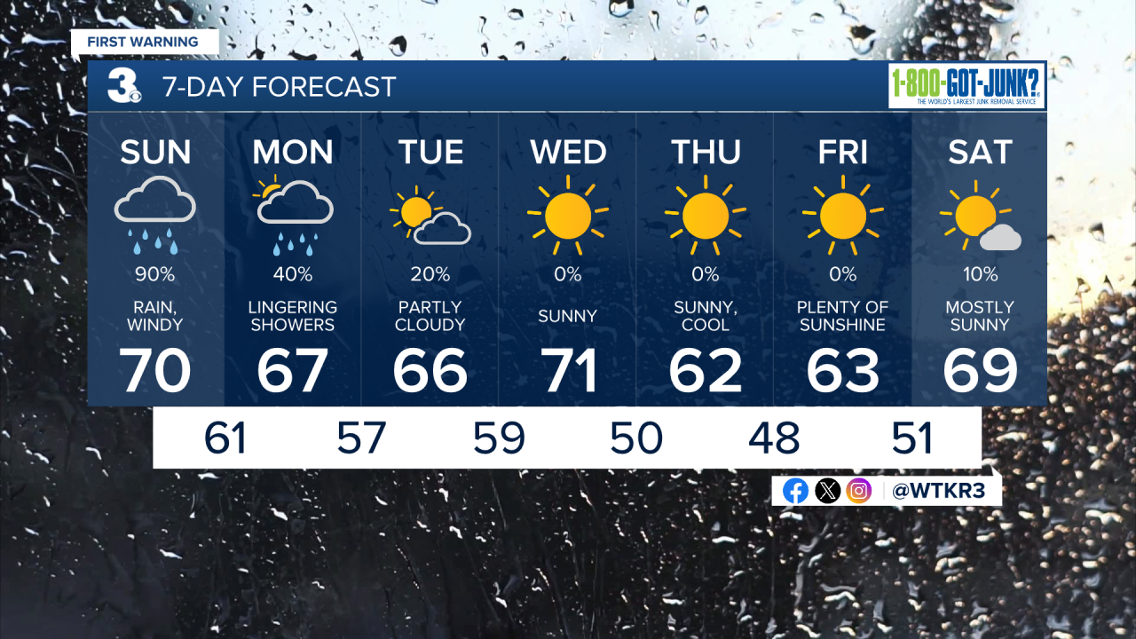 By Wednesday next week high pressure takes over and sunshine is expected. It will be cooler than normal, with highs in the low 60s Thursday and Friday.