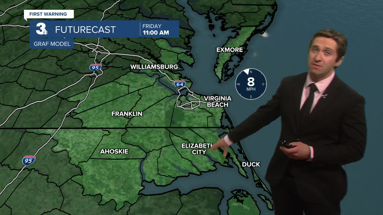 Friday will be even cooler, with many inland areas starting the morning off in the upper 30s with mid 40s closer to the coastline. Some patchy frost is possible in Sussex and Southampton counties in VA along with Northampton County in NC. Highs will reach the low to mid 60s by the afternoon. We'll see plenty of sunshine once again, with winds out of the WNW at 5-15 mph. Saturday will be another cool day with highs in the low to mid 60s along with mostly sunny skies.