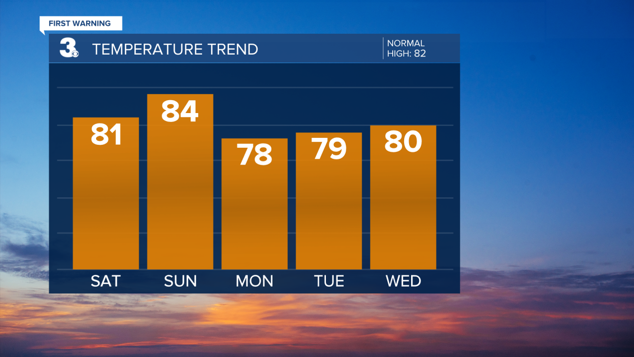 Temperatures will be running close to normal, with highs in the upper 70s and the lower 80s.