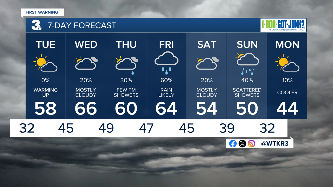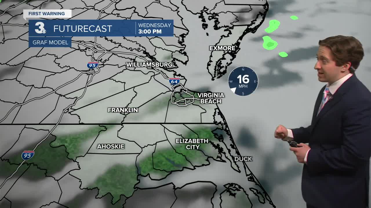 Wednesday will be a mild one with high temperatures jumping into the mid to upper 60s. It will be breezy, with winds out of the SW at 10-20 mph. We'll see mostly cloudy skies throughout the day, along with a slight (20%) chance of a stray shower during the afternoon. On Thursday, clouds will remain in place, with some scattered showers developing during the afternoon. Highs on Thursday will reach the low 60s.