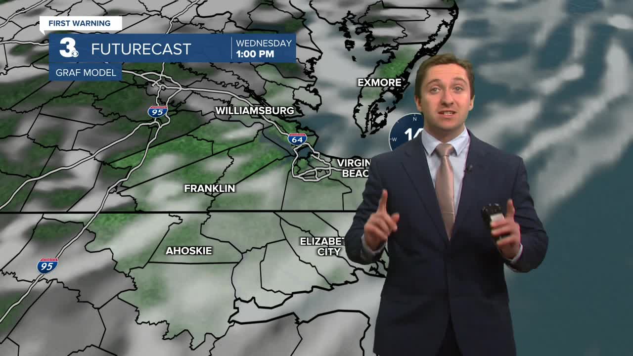 Wednesday will be near normal, with high temperatures in the low to mid 50s. We'll see sunshine early on followed by a mix of sun and clouds in the afternoon. Winds will be out of the SW at 10-20 mph. Overnight will be milder with temperatures staying above freezing in the mid to upper 30s. Thursday will start off partly cloudy, with increasing clouds during the afternoon. Highs will be pleasant in the upper 50s and lower 60s. Our next chance of rain arrives Thursday evening as a low pressure system approaches Hampton Roads.