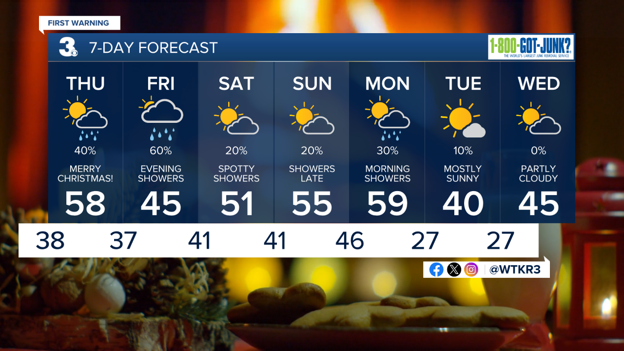 Showers arrive Thursday morning. The rain clears out in the afternoon. Highs this Christmas Day will be in the upper 50s near 60 degrees.