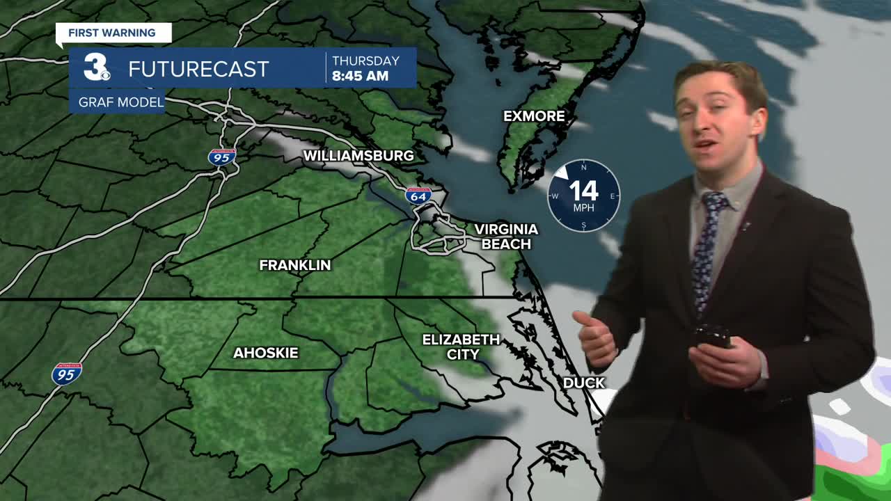 Overnight Wednesday, a cold front will start to move towards Hampton Roads, with a line of rain showers changing over to snow showers as temperatures drop. Little to no snow accumulation is expected, but some flakes before daybreak are possible. Temperatures in the 40s early Thursday morning will plummet into the low 30s by sunrise. Temps will then stay in the 30s for the rest of the day. Overnight will be chilly, with temperatures reaching the 20s and teens for inland areas. Friday will be mostly sunny and cool with highs in the 40s.