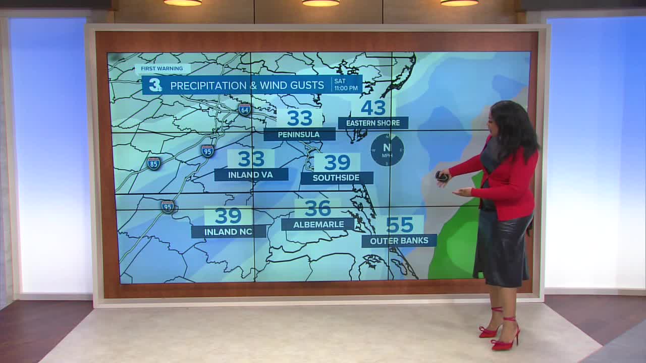There will be a very distinct snowfall cutoff which will skew some of the totals to the southeast and lower totals to the northwest. Either way, snow won’t be our only issue. There will be wind gusts of up to 45-60 mph. Highest winds will be along the Outer Banks. The wind will blow the snow around making it not only harder to accurately measure but cause visibility issues. Wind chill values dip below 0 degrees Sunday morning.