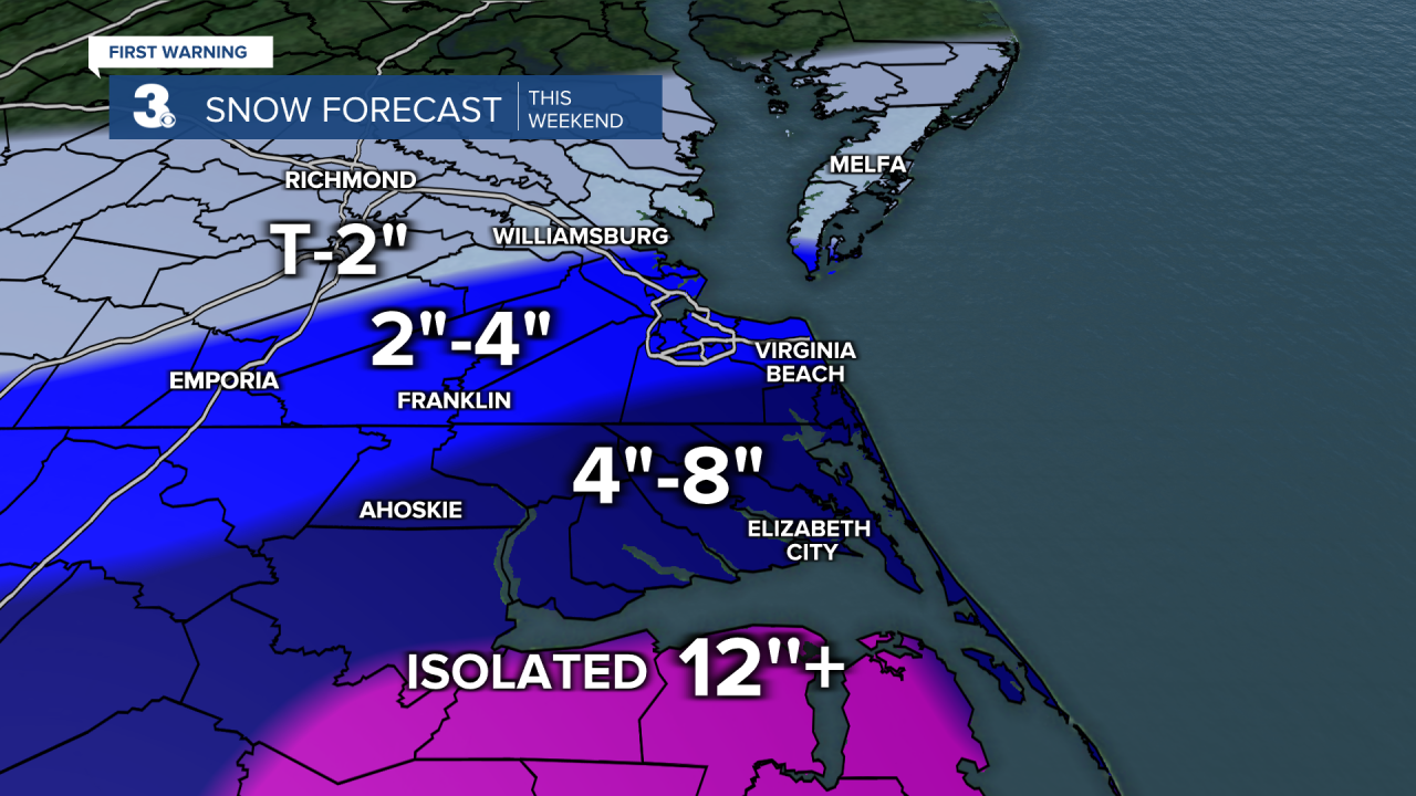 Snow starts first for portions of the Outer Banks. Northeast North Carolina is where we’re expecting some of the highest totals. 8-10'’ of snow will be possible, but some spots could see isolated amounts of up to 12’’.