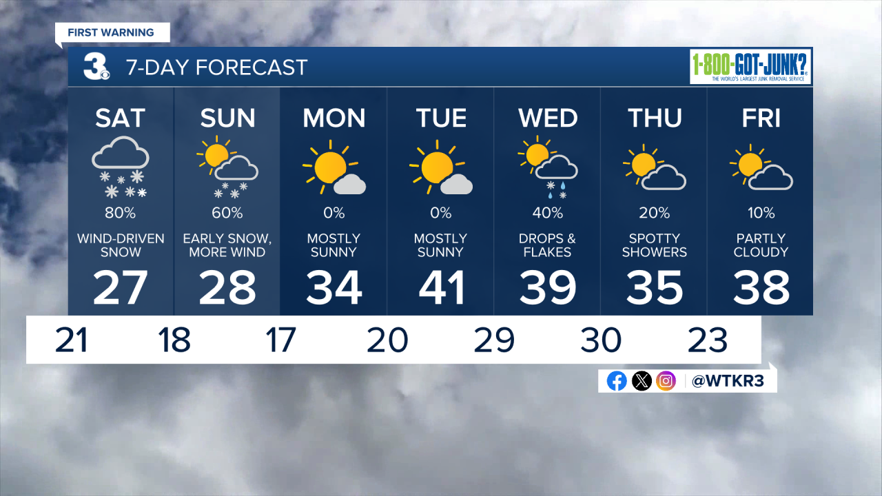 The below freezing temperature trend continues Friday. Snow showers arrive on Saturday.