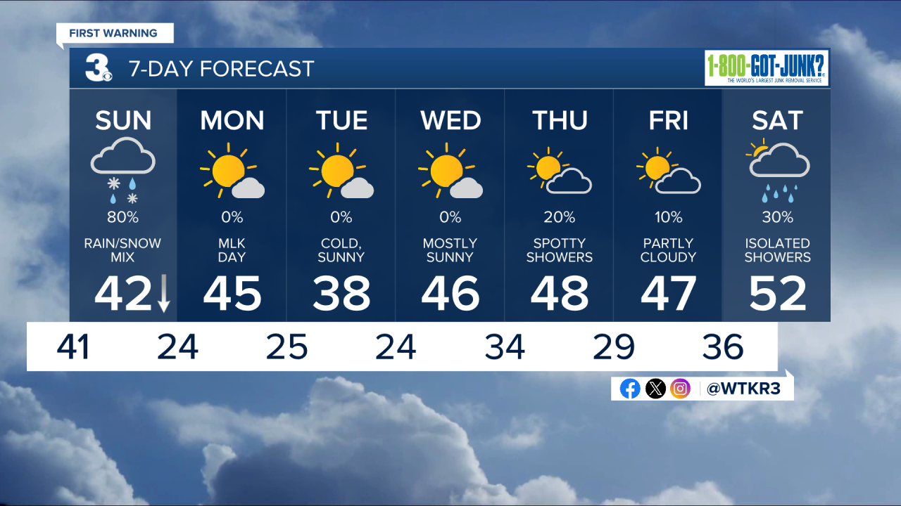 Skies clear out just in time for Martin Luther King Jr. Day! Highs will be in the low to mid 40s with plenty of sunshine.