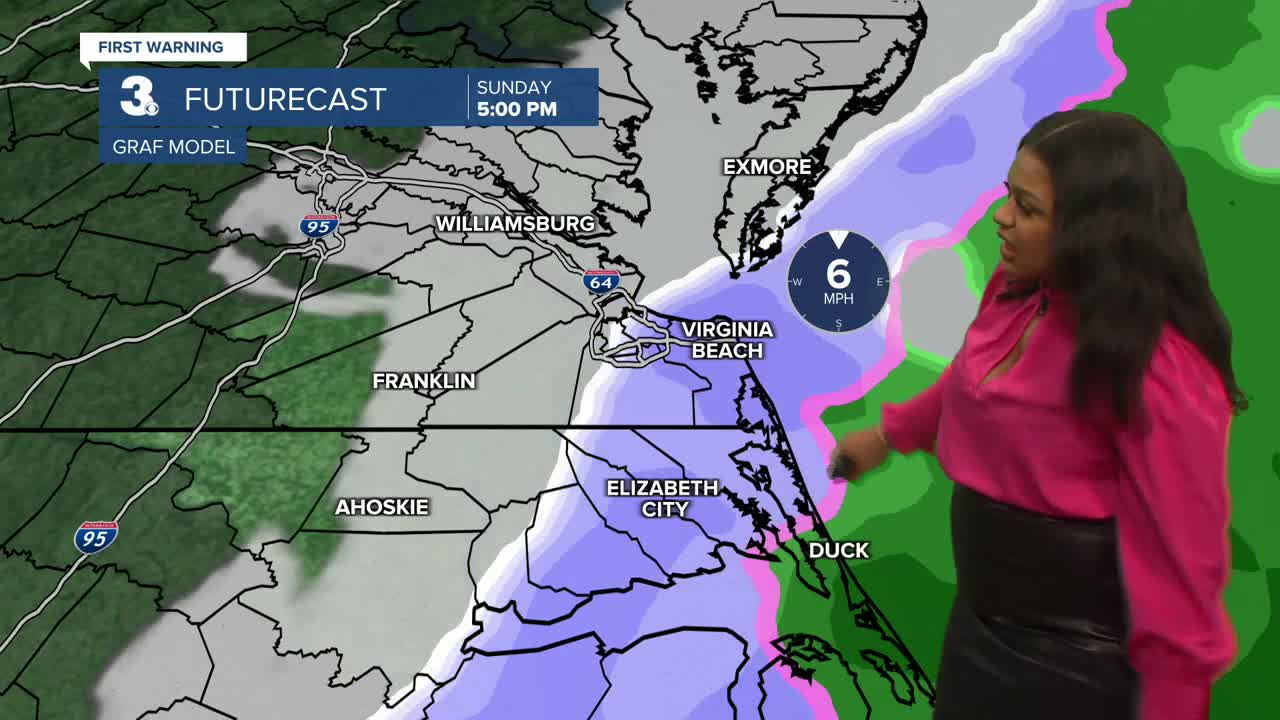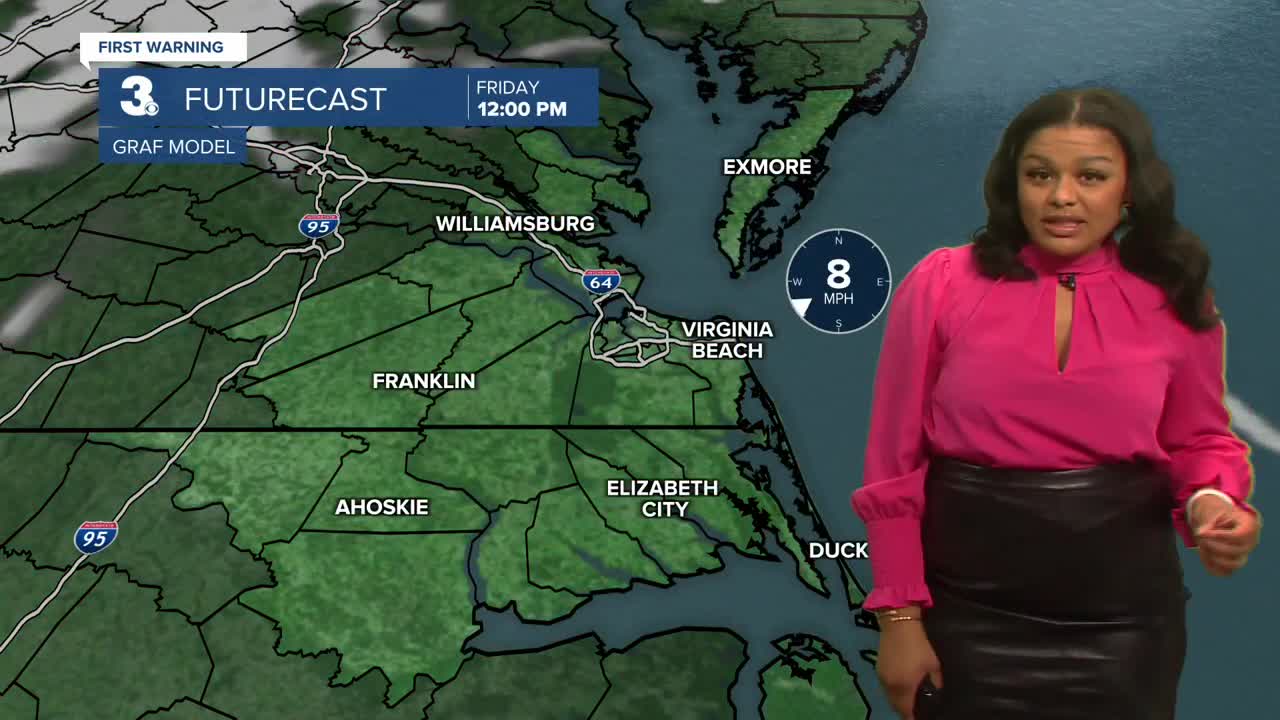 Saturday will be partly sunny with a chance of spotty showers in the afternoon. Highs will be mild in the upper 50s. On Sunday, precipitation chances will be higher as we track an off shore nor’easter bringing a mix of rain and snow. Highs Sunday will be in the low 40s.