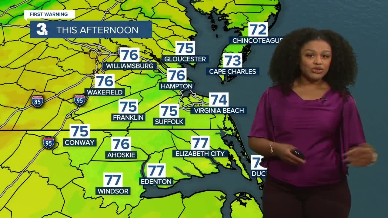 Scattered showers move in today as a cold front crosses the region. High temperatures this afternoon will be in the upper 70s. Tonight, the rain fades. Lows will be in the upper 50s.