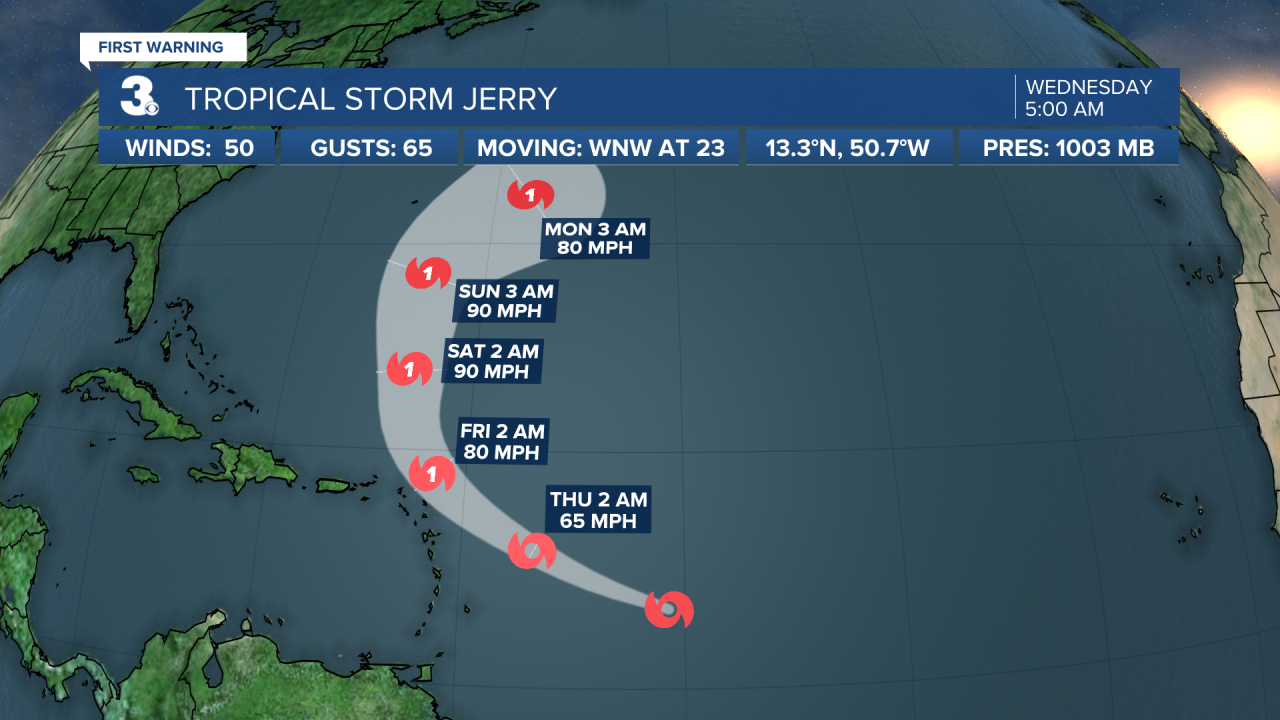 Tropical storm Jerry is moving quickly WNW across the central Atlantic. It is forecast to become a hurricane by the end of the week. It is not expected to impact Hampton roads at this time.