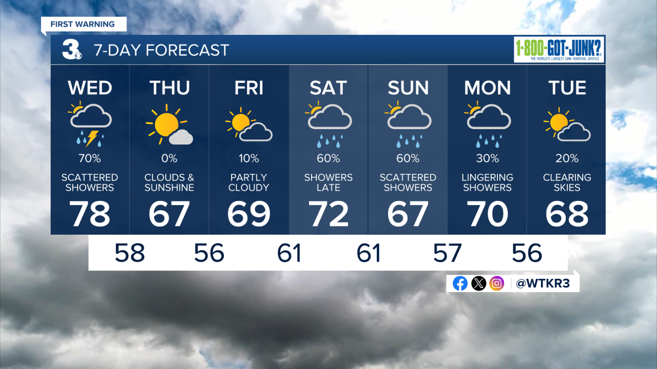 Skies clear out Thursday. It will be less humid and warm with highs struggling to reach the 70.