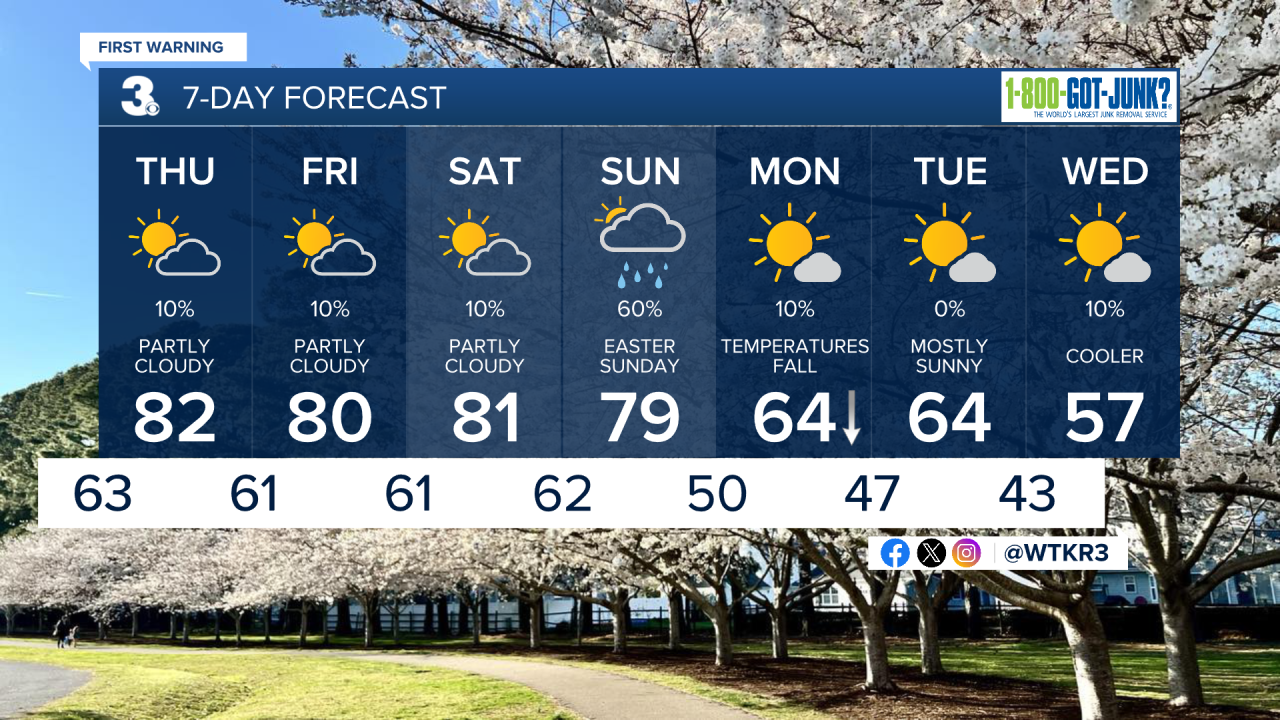 Highs fall throughout Monday morning as the front clears the area. By next Wednesday, highs will only be in the upper 50s.