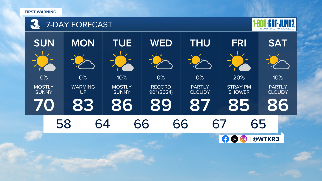 Heat continues to build next week, with high temperatures in the mid to upper 80s on Tuesday and near 90 degrees on Wednesday. Dry weather is expected to persist this week, with just a stray shower possible on Friday.
