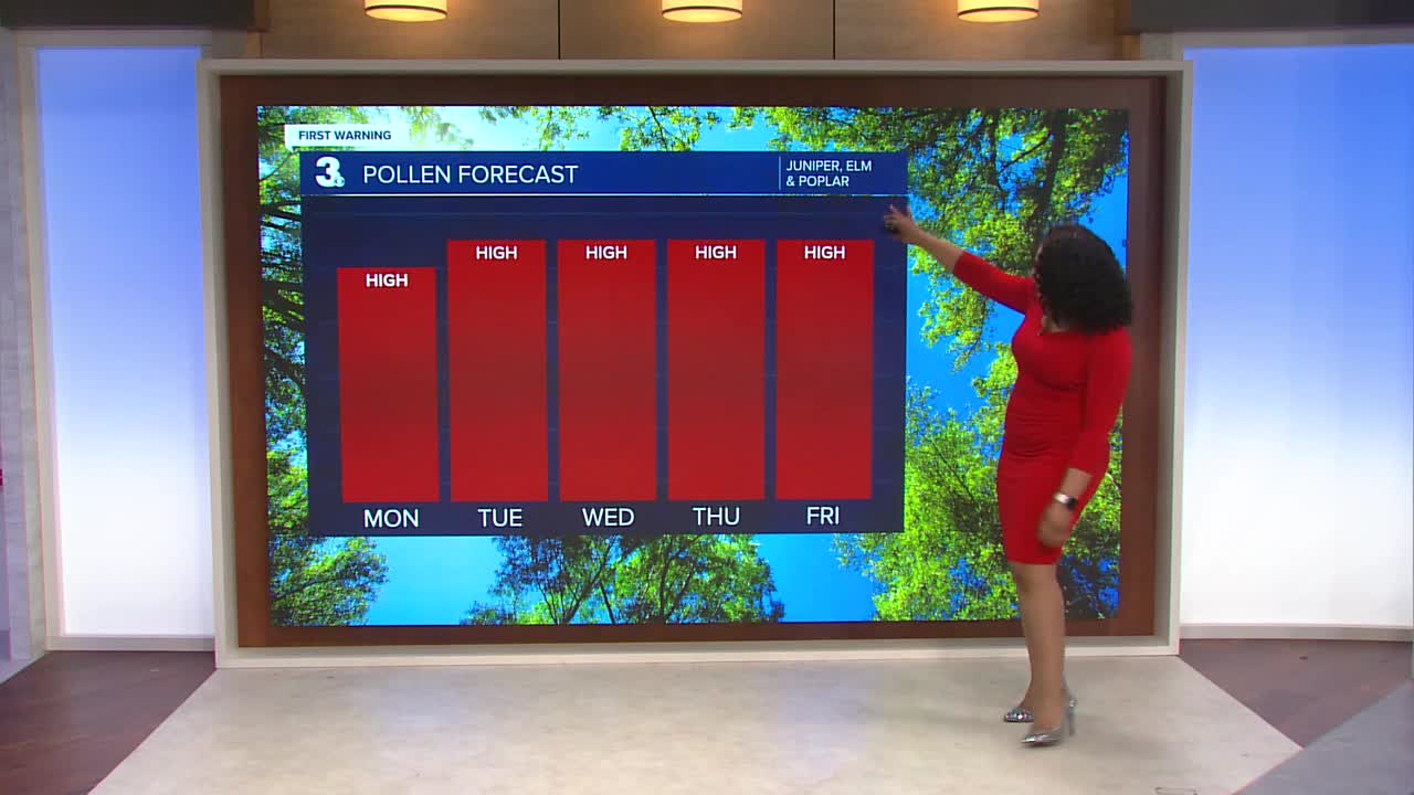 With the warmer temperatures, pollen levels will be high all week long. You might want to wash some of the pollen build up off your car at the beginning of the week before slightly higher rain chances return over the weekend.