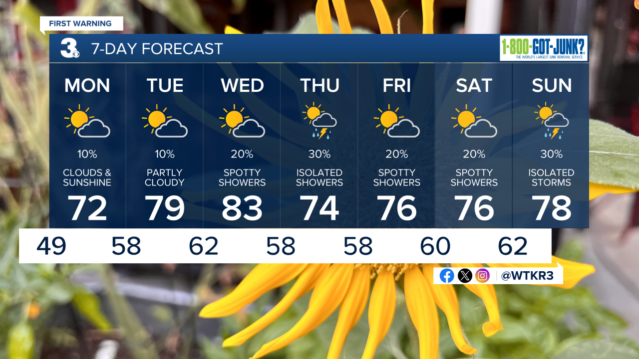 Monday morning, we’ll see plenty of sunshine. More comfortable conditions return in the afternoon with highs in the low 70s. A few spotty showers will be possible along the Outer Banks.