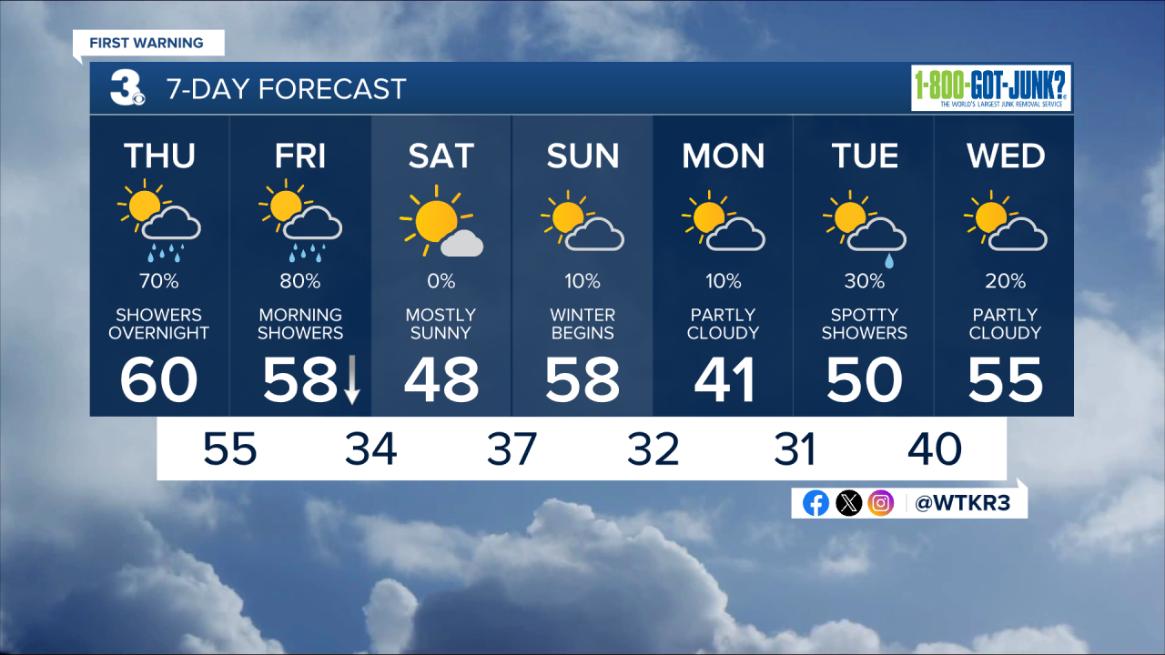 The weekend will be off to a cool and sunny start. The Winter Solstice officially begins on Sunday. Temperatures hover in the 40s and 50s through Christmas Eve next week.