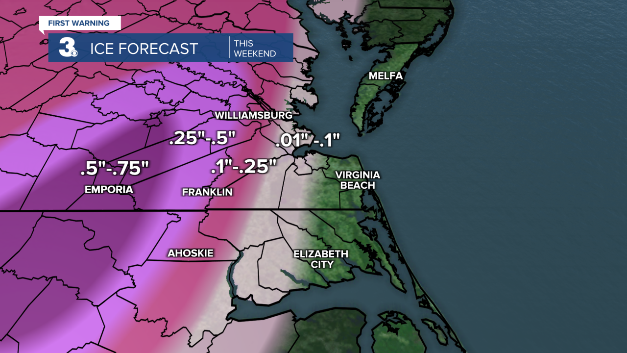Snowfall begins Saturday night. Once the snow is all said and done, we’re looking at up to an inch from the Albemarle to Southside and up to eight inches for the Peninsulas. The snow makes the transition to sleet and freezing rain Sunday morning and eventually all rain. Locations that see less than five inches of snow will see any accumulation being washed away. Those with higher snowfall total amounts, primarily areas in the direction of I-95, will be at risk for some ice.