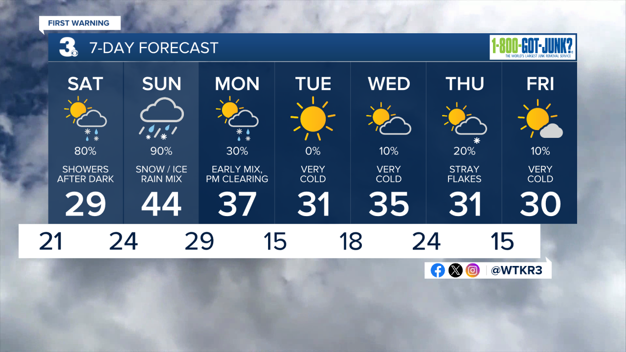 Friday is our “calm before the storm.” We’ll see mostly cloudy skies and a few spotty showers. Temperatures make a run for 50. Winds pick up overnight and temperatures drastically drop Saturday morning.